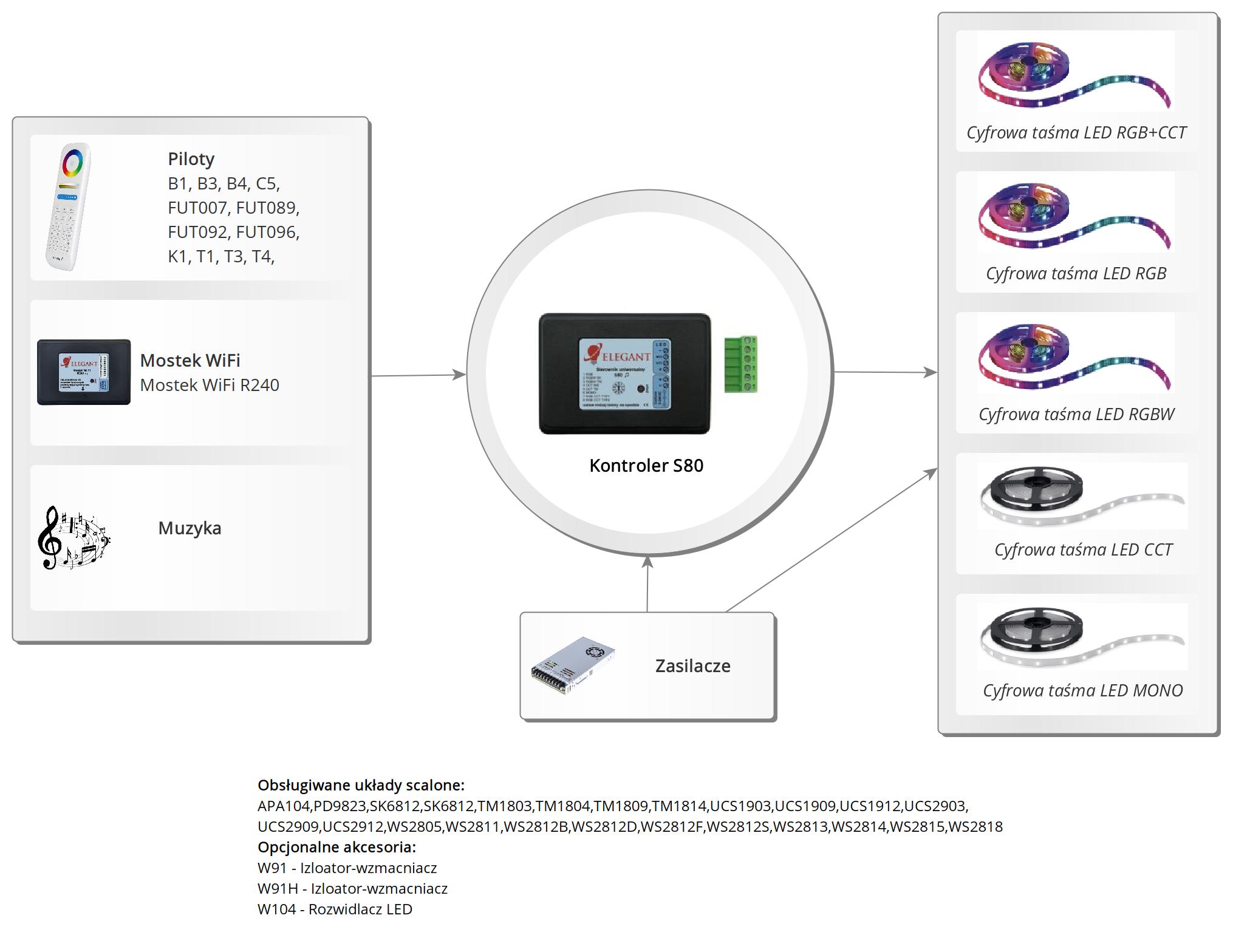 Sterownik LED S80 umożliwia sterowanie cyfrowymi taśmami (pikselami) LED z użyciem pilota radiowego lub mostka Wi-Fi R240. Sterownik posiada ponad 110 wbudowanych efektów oraz umożliwia obsługę stref (sterowanie jednym pilotem niezależnie wieloma odbiornikami). Dzięki wbudowanemu mikrofonowi reaguje na dźwięk, a dzięki obsłudze wszystkich popularnych układów scalonych taśm cyfrowych współpracuje z każdym rodzajem taśmy – RGB, RGBW, CCT, MONO oraz RGB+CCT.